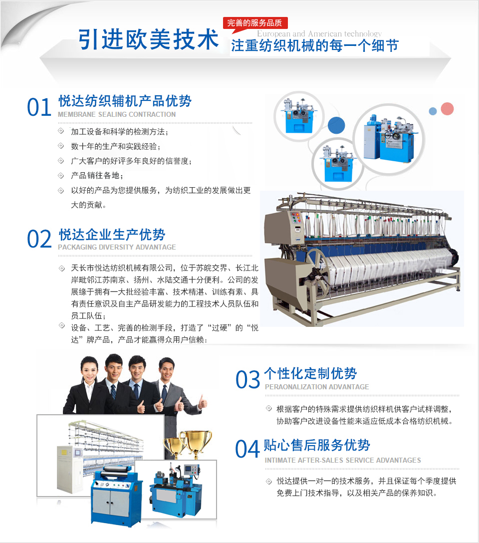 天長(zhǎng)市悅達(dá)紡織機(jī)械有限公司座落在皖東天長(zhǎng)市仁和集鎮(zhèn)人民西路88號(hào),公司位于蘇皖交界、長(zhǎng)江北岸毗鄰江蘇南京、揚(yáng)州、水陸交通十分便利。 公司是主要生產(chǎn)紡織平車安裝工具、紡部輔件及配件綜合性企業(yè)。已有二十多年的生產(chǎn)歷史,在激烈的市場(chǎng)競(jìng)爭(zhēng)中始終保持優(yōu)良的質(zhì)量、優(yōu)化的價(jià)格、齊全的品種優(yōu)勢(shì)。產(chǎn)品暢銷全國(guó)各地,深受新老客戶的好評(píng)。 公司以服務(wù)客戶滿足用戶為己任,不斷提高產(chǎn)品加工精度,拓展系列品種,以高標(biāo)準(zhǔn)、高起點(diǎn)滿足客戶需求。公司精神:創(chuàng)新、開拓、務(wù)實(shí)。公司宗旨:追求誠(chéng)信、追求質(zhì)量、追求服務(wù)、為用戶著想。